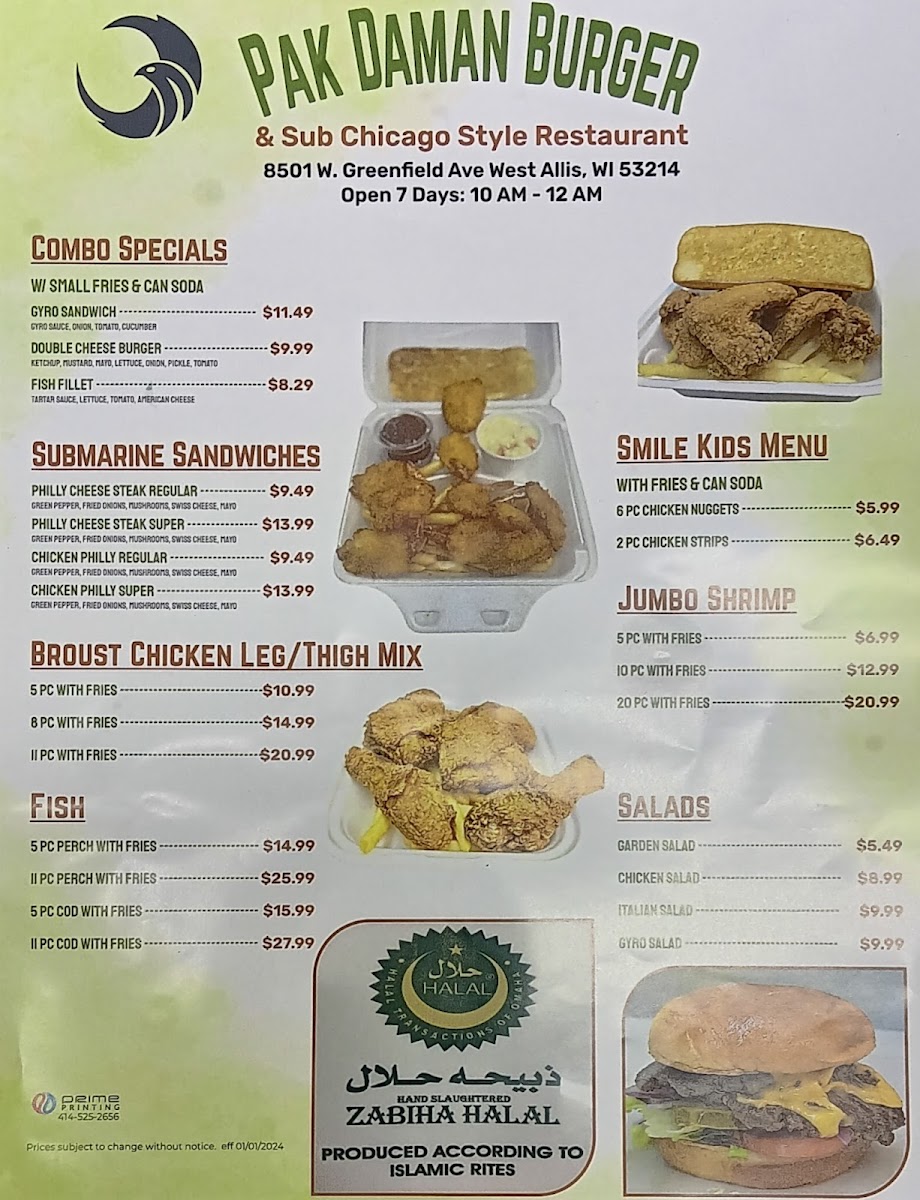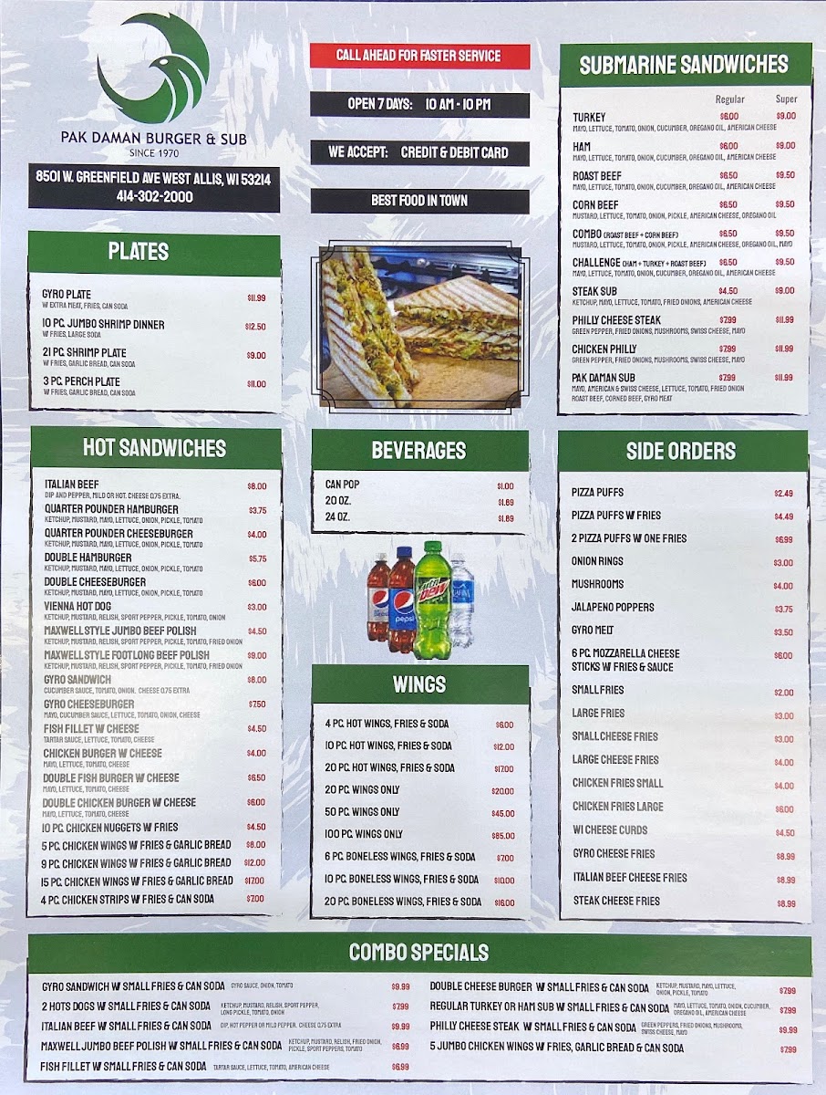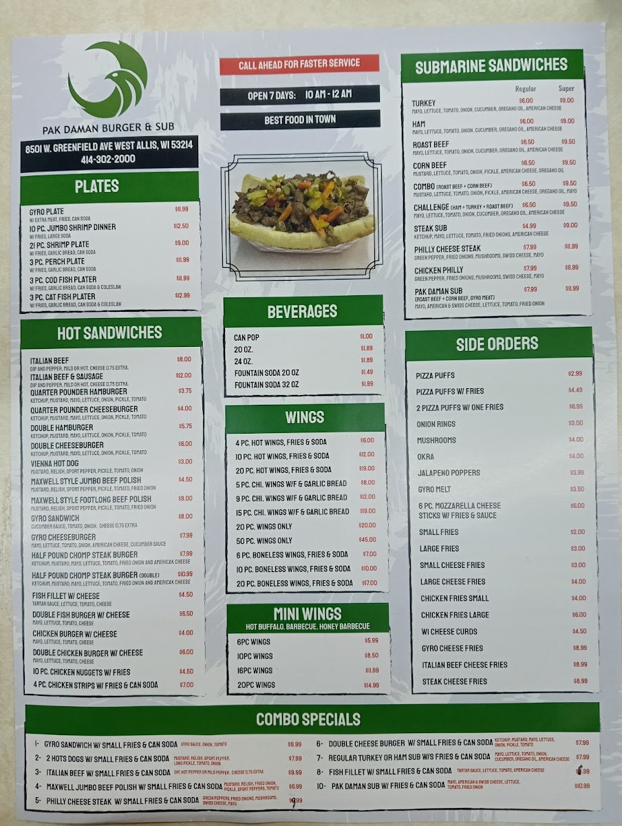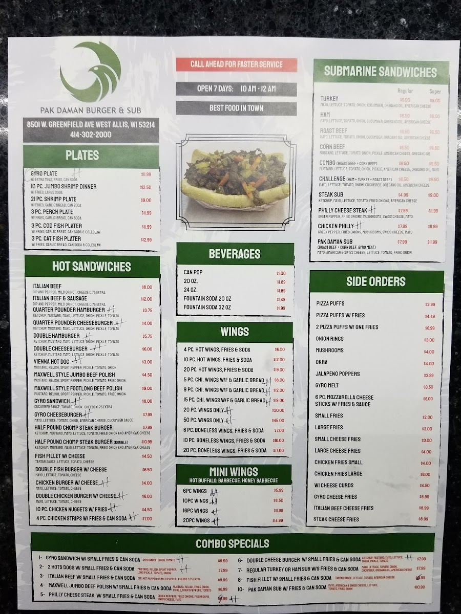 Welcome to Pak Daman Burger & Sub, a culinary gem nestled at 8501 W Greenfield Ave in West Allis, WI. Renowned for its fresh and delectable offerings, this eatery promises a delightful experience for all food enthusiasts. With a vibrant menu that caters to various cravings, it's the perfect spot for lunch, dinner, or even late-night bites.