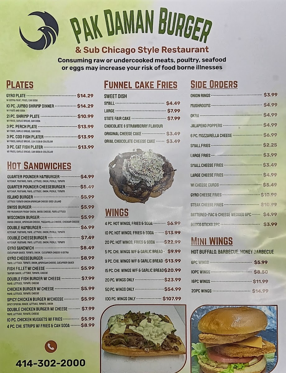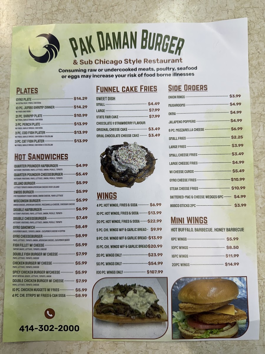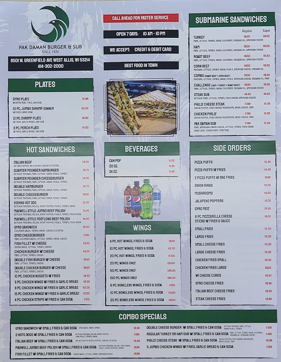 Welcome to Pak Daman Burger & Sub, a culinary gem nestled at 8501 W Greenfield Ave in West Allis, WI. Renowned for its fresh and delectable offerings, this eatery promises a delightful experience for all food enthusiasts. With a vibrant menu that caters to various cravings, it's the perfect spot for lunch, dinner, or even late-night bites.